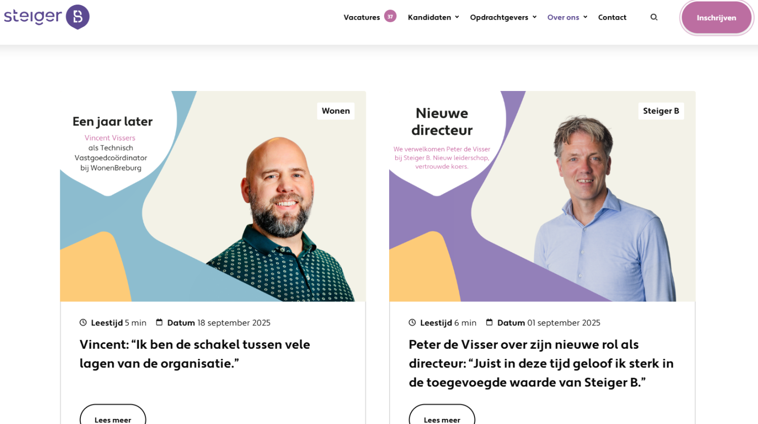 Sinds januari 2025 schrijven we onder meer 2 keer per maand een webartikel voor Steiger B. Sandra en haar collega’s leveren de onderwerpen en gegevens van de contactpersonen aan, wij zorgen voor de interviews en de teksten. “Omdat we het contentbeheer naast ons gewone werk doen, schoot het er vaak bij in”, vertelt Sandra. “Maar jullie blijven strak op de planning. En nemen voor ons veel uit handen. Aan een half woord hebben jullie genoeg om te snappen welke kant we op willen met de artikelen. We voelen ons daardoor echt ontzorgd. Sterker nog: voor het eerst lopen we nu zelfs vooruit op onze contentplanning. Heel fijn!”